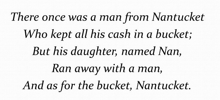 I heard my first limerick when I was about 7 years old when I was eavesdropping on my father and one of his friends. I heard my dad recite this little gem. My love of limericks was born!