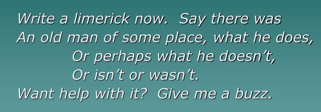 That’s lesson number one for today. If you read them carefully, he gives excellent rhyming tips and how exactly to structure the limerick. More to follow tomorrow.