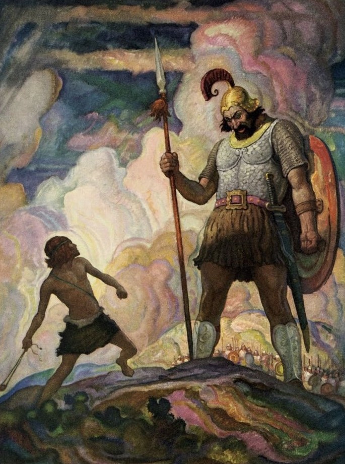 - According to the Bible, what weapons was the Philistine giant Goliath carrying when he was slain by David? A sword and a spear, according to I Samuel 17:45.