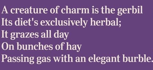 I tend to look for publications containing limericks and I like them funny, silly, bawdy, and outright outrageous. Many of my readers constantly complain that my selections are too tame. They want lots of sexual content and even go so far as to complain about my selections of children’s limericks. I enjoy posting the more innocent lyrics from kids with the hope they will someday grow up and write some truly memorable and bawdy poetry. Someone has to assist the next generation in their endeavors, and I have gladly volunteered. Here are a few you can sample . . .