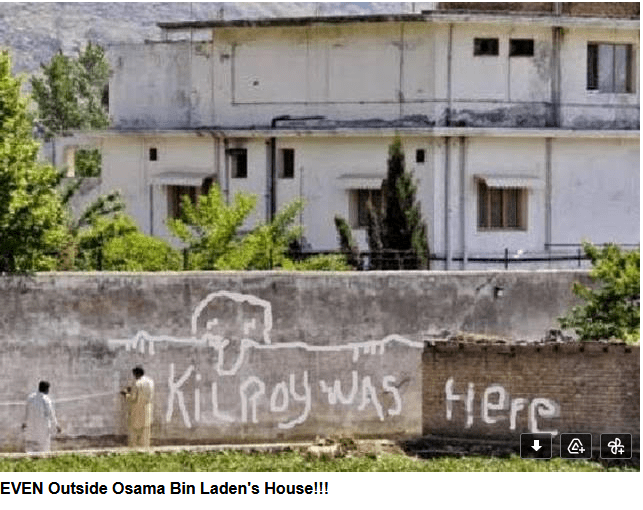 Just as an aside, I can’t tell you how many times when I was in the Army both here in the US and overseas, I discovered very quickly that “Kilroy was (already) here.” It was scrawled everywhere. Once while in Korea I was climbing through a deserted gun emplacement in the hills near Inchon. There was old graffiti on the walls from some Turkish soldiers which I couldn’t read and right next to them was a huge “Kilroy was here!” Most recently and most poignant was this magazine photo taken at the home of Osama bin Laden just after his capture.