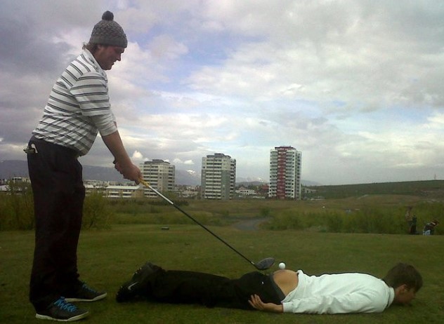 One of his drives landed inside an old shoe that lay on top of the workman’s wheelbarrow. After deciding not to take a penalty for dropping the ball out of the chute, he found a novel solution. He played the shoe.