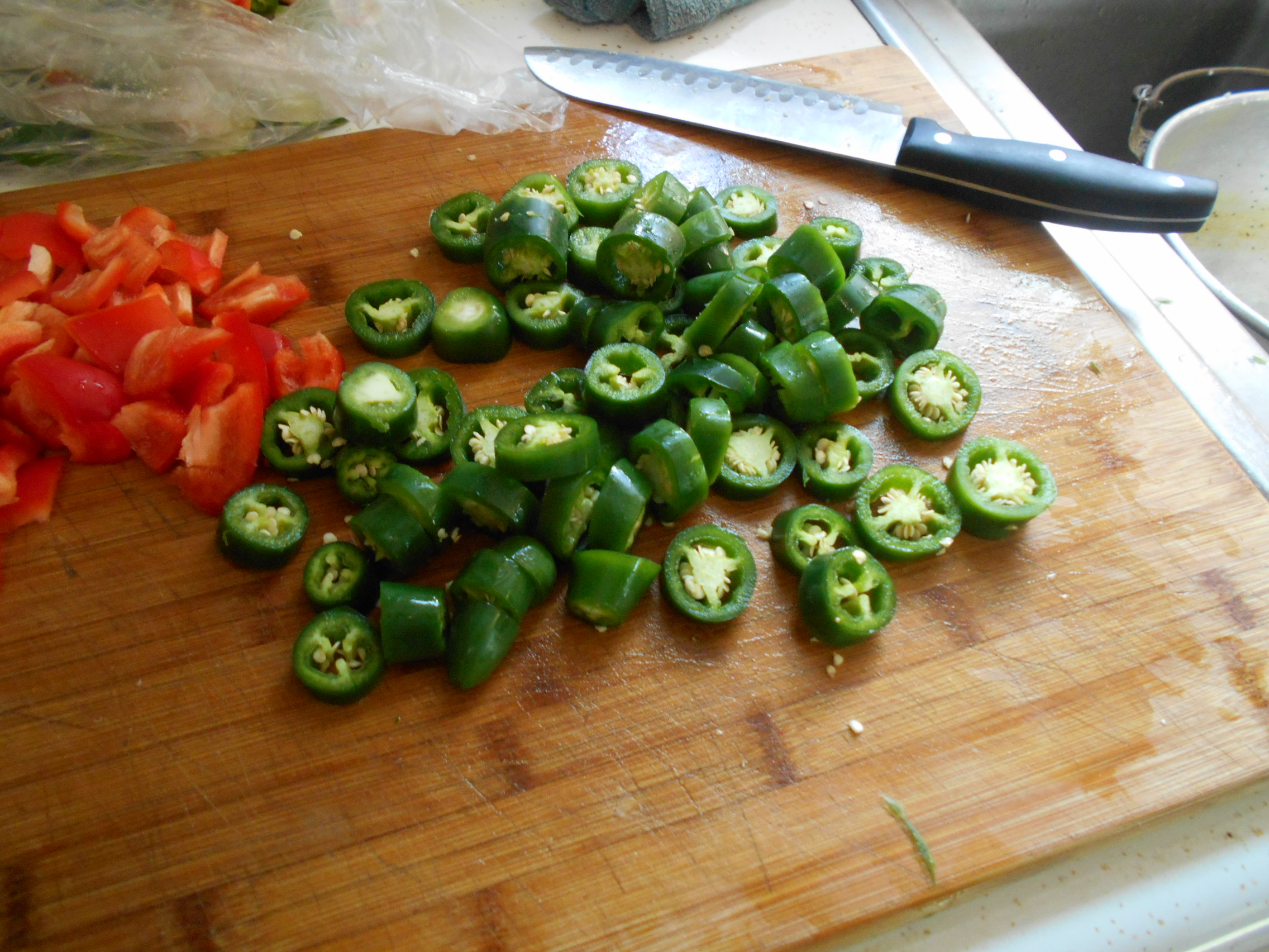 They are then sliced along with the red pepper and jalapenos. All are set aside until I’m ready to fill the jars.