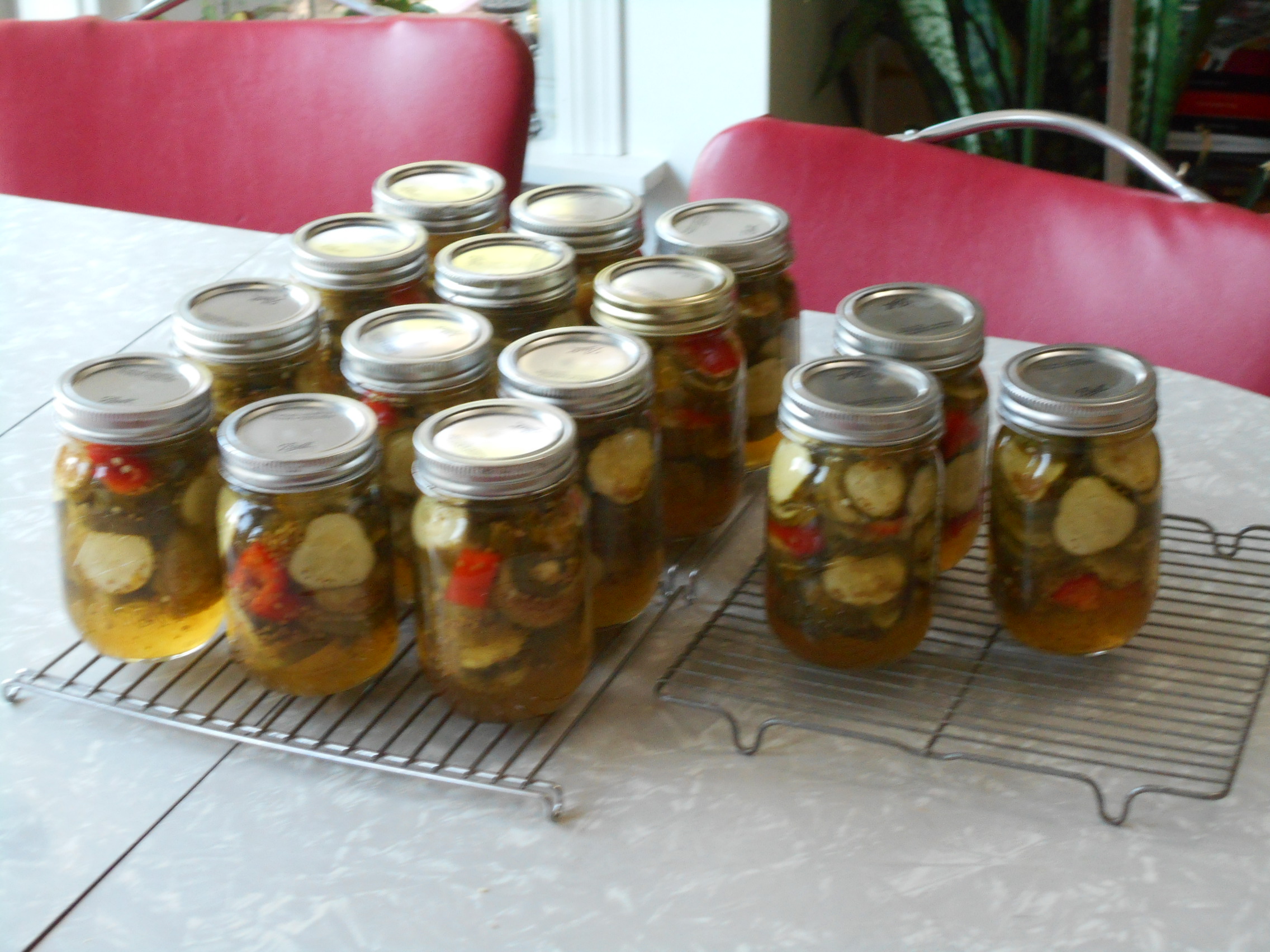 Getting the first batch of the season completed is always a good feeling. Here’s the finished product . . . 15 pints of very hot and sweet pickles. They’ll be ready for eating after they sit for a few months to absorb all of the flavors.
