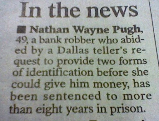 - A pair of Michigan robbers entered a record shop nervously waving revolvers. The first one shouted, “Nobody move!” When his partner moved, the startled first bandit shot him.