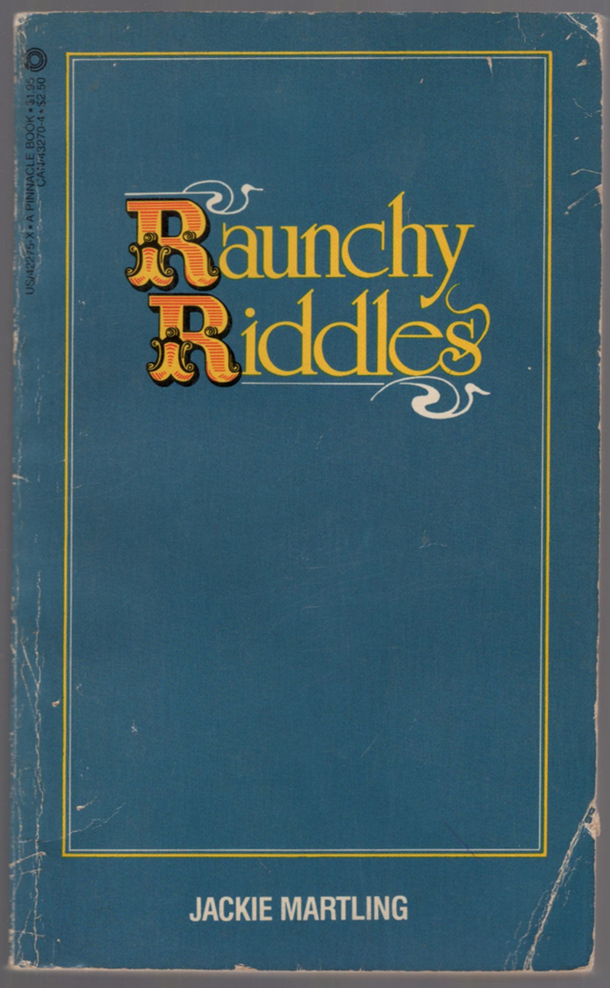 I just received a request from a reader to post something lighthearted and fun for a change. Since I’m neither lighthearted nor funny, I did some research and found a small paperback book hidden on a bookshelf behind some others. It’s titled Raunchy Riddles and after reading a few entries I know why it was hidden. I suppose it could be considered lighthearted and funny but that would be stretching the truth a little. This is 1980’s humor at its absolute worst. This post is dedicated to that foolish reader who requested it. Here we go!