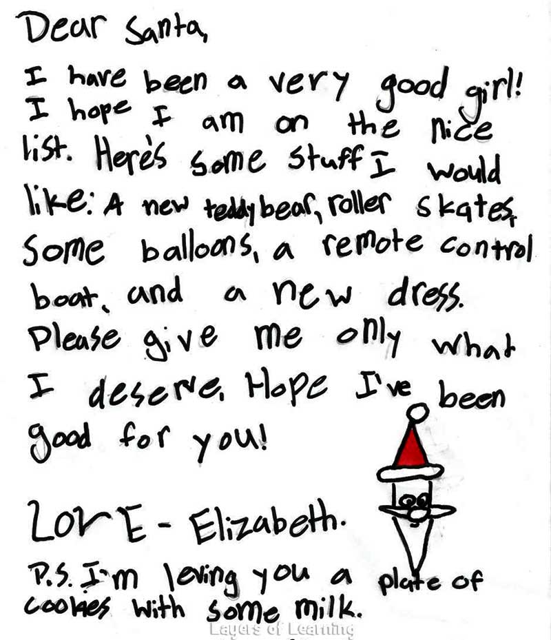 I hope you like the cookies I made. I have been good this year. I hope the reindeer get enough food. I hope you have a safe trip. I wish you a Merry Christmas. Love, Elizabeth